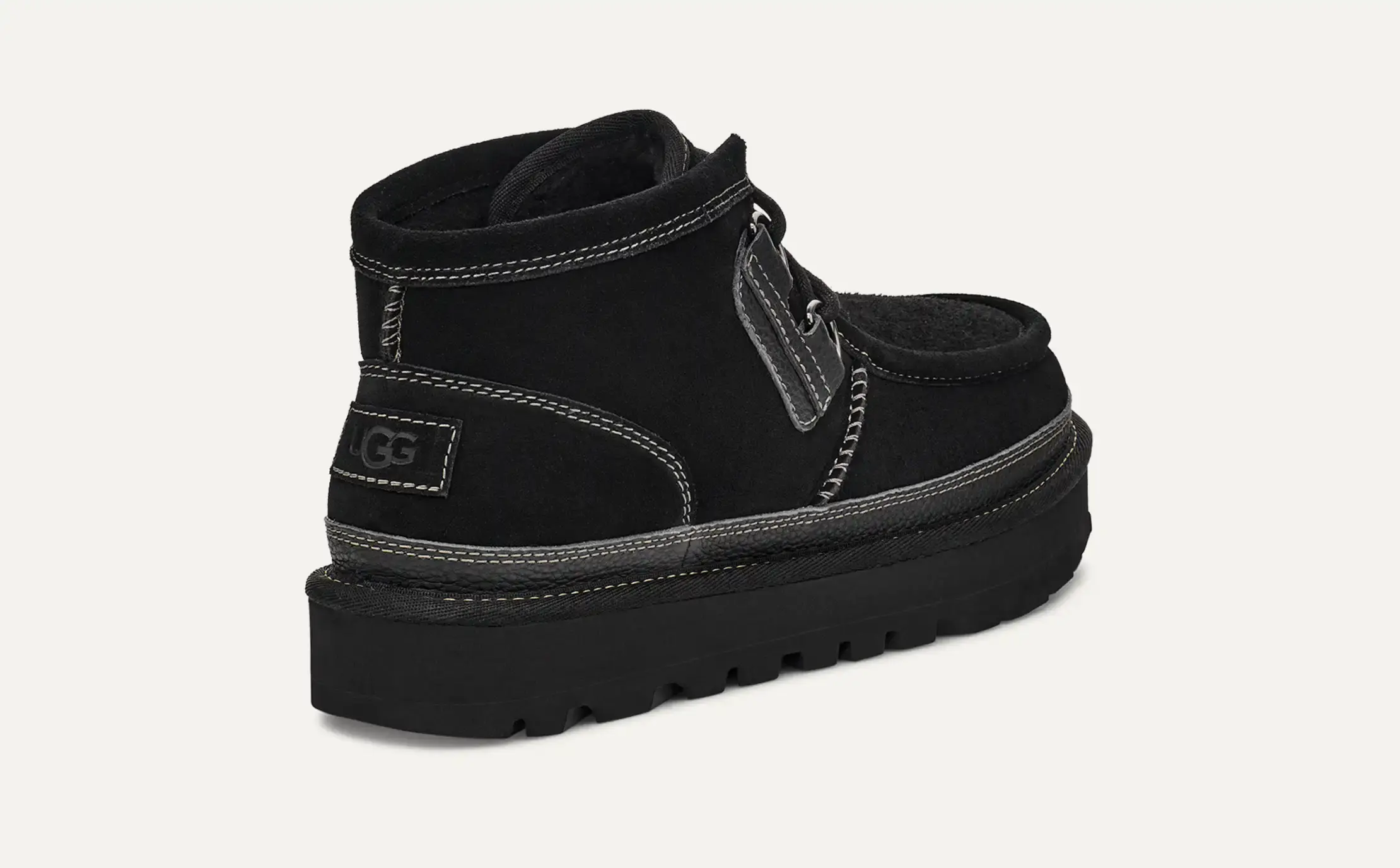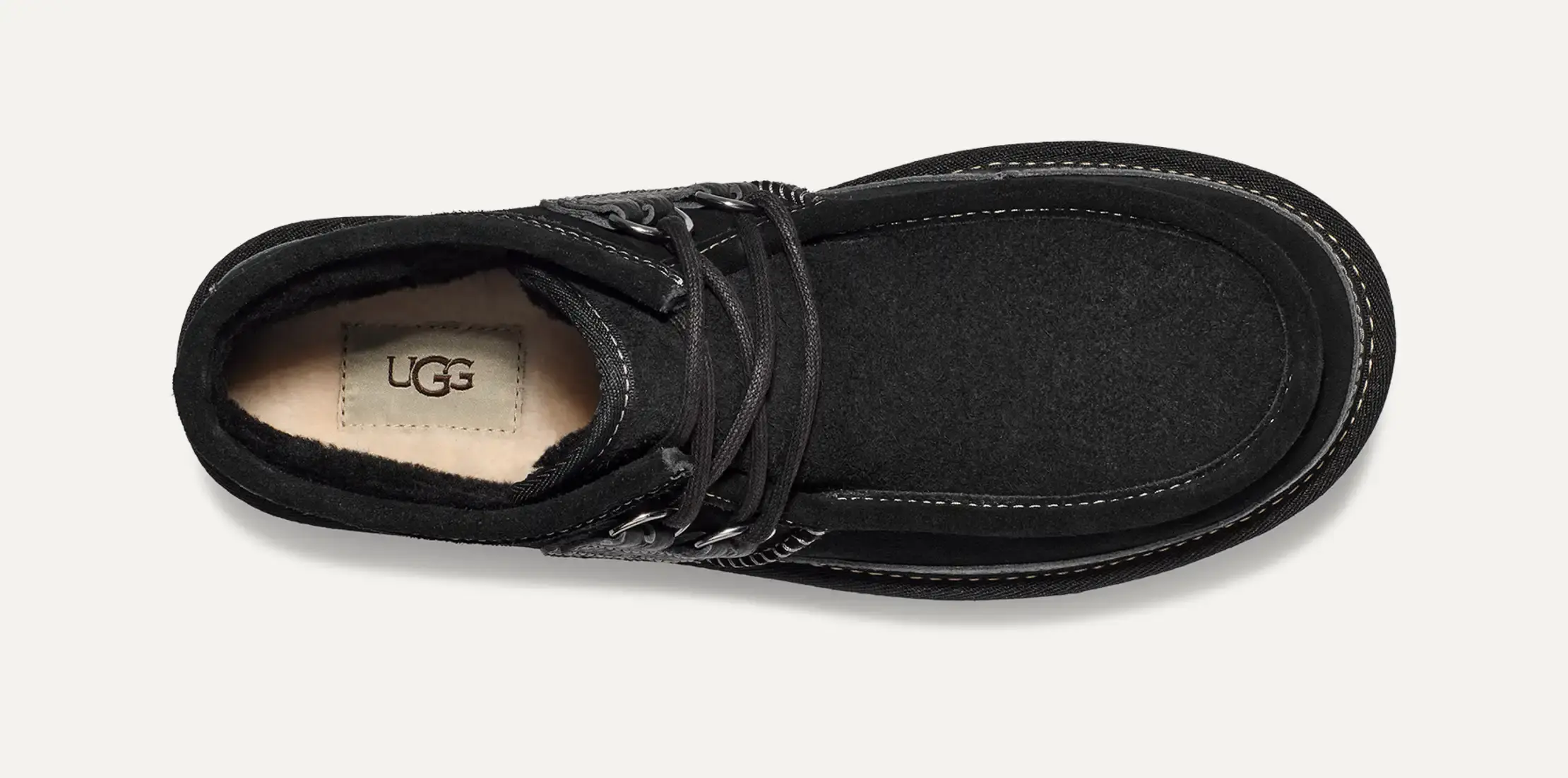 UGG Mens Hayden Moc Chukka Black — мужские чукки для rugged-стиля: матовая черная замша + натуральная овчина внутри удерживают тепло до -25°C, отводя влагу для сухости в снегопад, мороз или слякоть. Высокий берц с протектором обеспечивает хватку на льду, снегу и мокром асфальте, кожаные элементы добавляют премиум-вид — идеально для города, работы или outdoor.